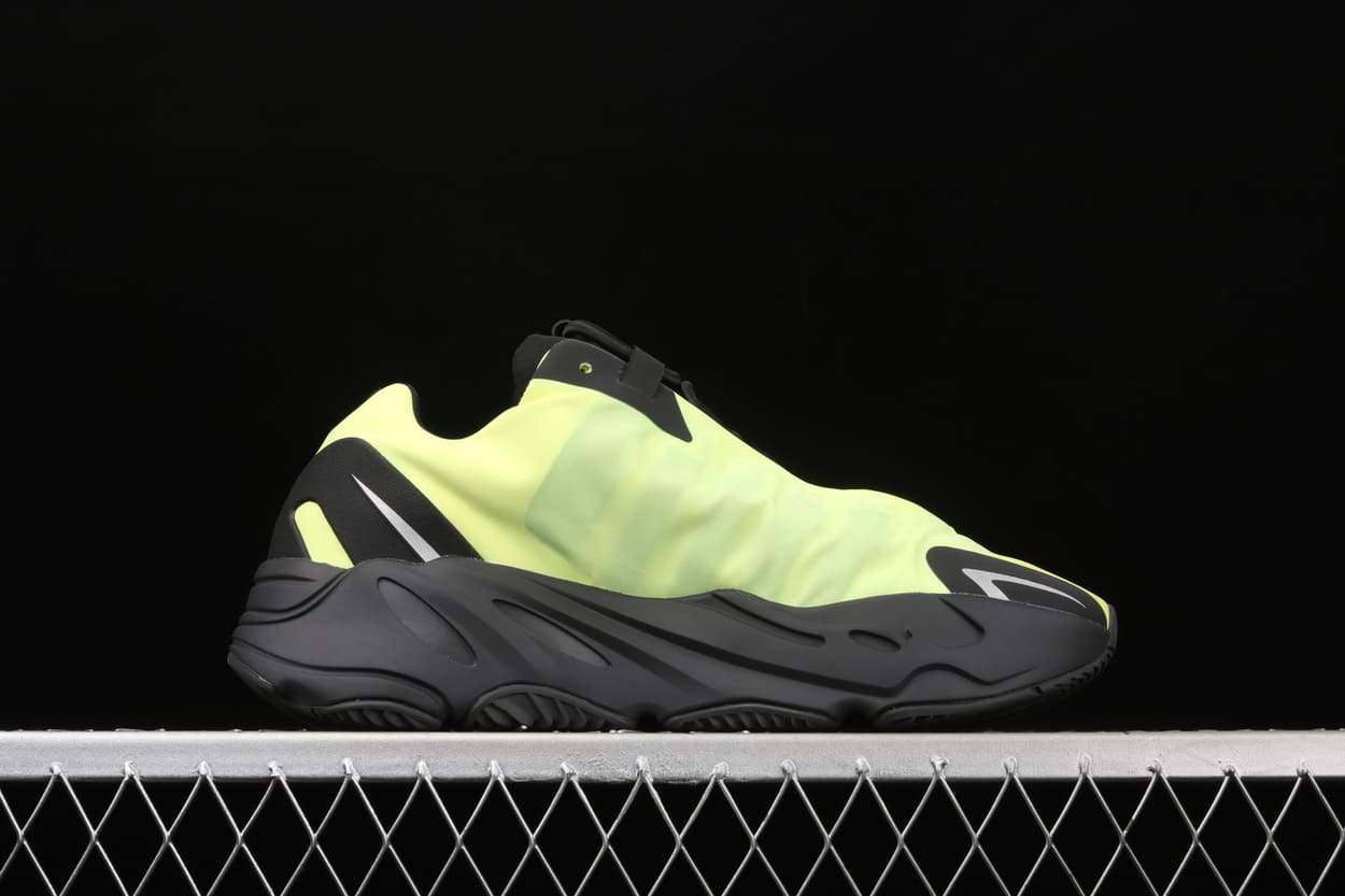 The upper of the adidas Yeezy Boost 700 MNVN Phosphor pair is Neon Yellow with its pull tabs and toe featuring a black colorway.